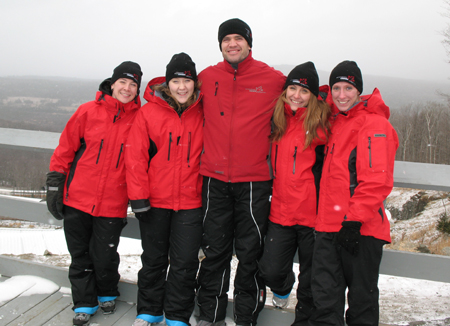 Since we were all dolled up in our fancy uniforms for the race today, the four girls on the team decided to capture a few moments on camera afterward. This all started out very civilized with a lovely picture overlooking the Lake Placid Valley, colour-coordinated and symmetrical. From left to right: yours truly; Micaela, our coach Duff, Darla and Shannon.