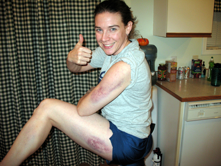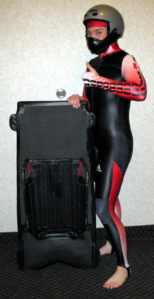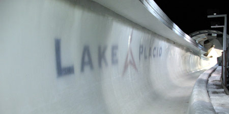 Here I am! Round two of the America's Cup circuit in Lake Placid, New York. We got here late last night and I got a chance to walk through the track in preparation for today. This here is Curve 18. Don't be fooled by it's pretty paint job, or by the word "curve" in its name. It might as well be a 15-foot high vertical wall ... oh wait ... IT IS.