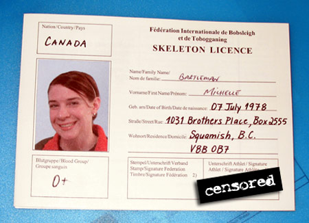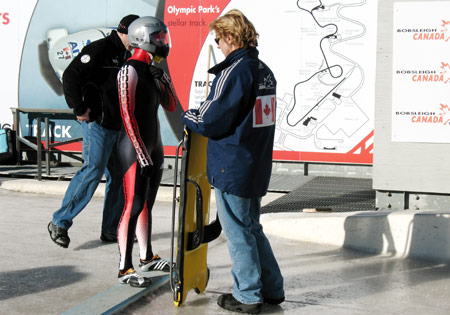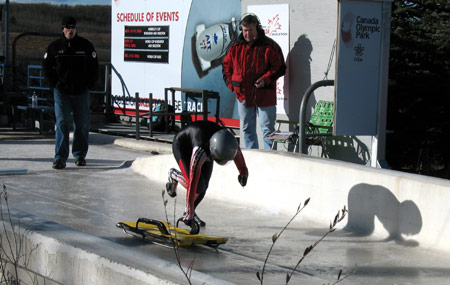 So, to begin: After my skeleton school, the last week of October, I was invited to be a member of one of Canada’s three national teams, and race on the America’s Cup circuit for the 2006/2007 season. Seeing as I had only been down the track from the top a total of five times, when I received the exciting news (and one of those trips down resulted in bruises that I have had to explain more than one time are not courtesy of my husband … ) I can only imagine that my invitation is based on a combination of how good I look in spandex and the fact that I was the only willing to go down the track again after we finished our school. (I kid … there were a good dozen of us crazies, not only willing but excited to get on our sleds again …)
