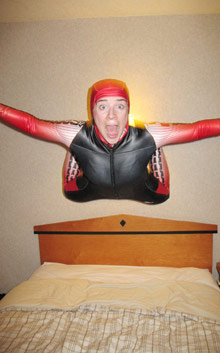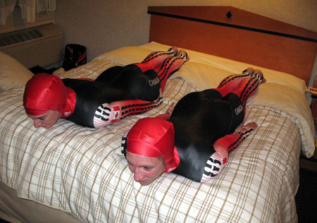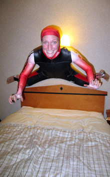 No, of course that is not me, all giddy trying on my new racing suit and posing by my sled with bare feet in the hotel room.